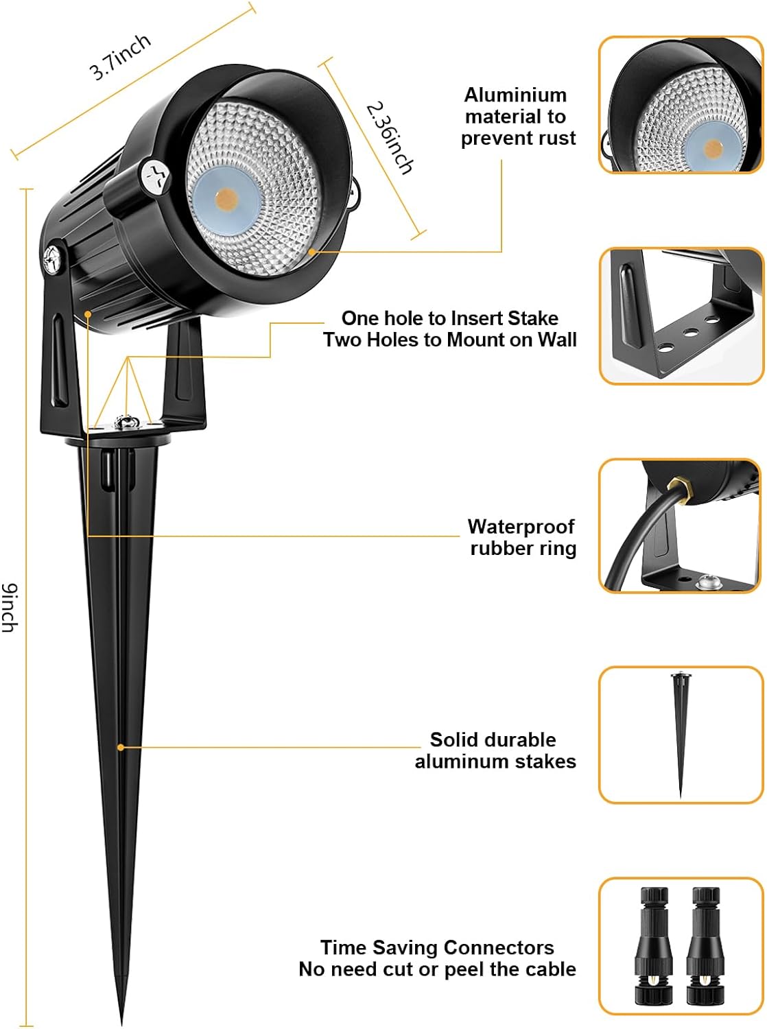 • 【2 Ways of Installation】 The three hole design and sturdy metal stakes makes it secure to mount on walls or insert into the ground, which can effectively decorate your garden, yard, and lawn. And ZUCKEO quick-fit wire connector solves the difficulty of splicing and crimping wires, greatly accelerating wiring work.(Transformer and low voltage wires are NOT INCLUDED in this package)