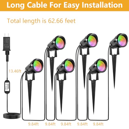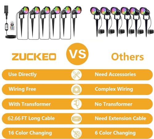 • 【All in One Full Set】ZUCKEO RGB landscape lights kit includes 6 spotlight, 1 transformer and 62.66FT long cable. All in one full set design, no need to purchase expensive wire and transformer.